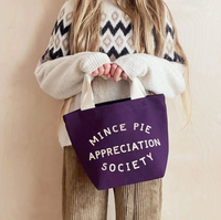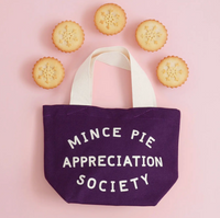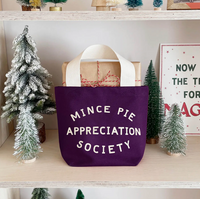 Grab this mini tote bag for your festive essentials and become a member of the society celebrating (arguably) the best Christmas snack ever! Fill with mince pies and other festive treats to make the perfect mini Christmas hamper. Also makes a beautiful reusable gift bag for true mince pie aficionados! 'Mince Pie Appreciation Society' design has been screen printed in off-white on sturdy canvas. Available in plum!