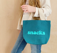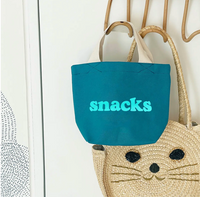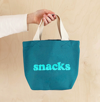 The 'Snacks' design has been screen printed in teal on sturdy blue canvas.