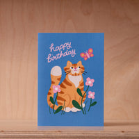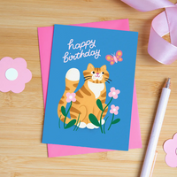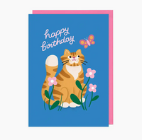 This cat and butterfly card is the perfect card for cat lovers everywhere! It features an adorable illustrated cat amongst pink flowers looking admirably at a butterfly, and reads "happy birthday".