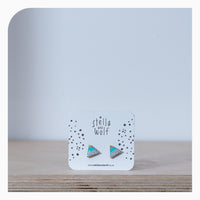 These wooden triangle earrings have been hand painted in pastel turquoise and white and have a contemporary black spotty design. They have been decorated with a touch of gold leaf and are finished with a resin to give a high gloss finish.