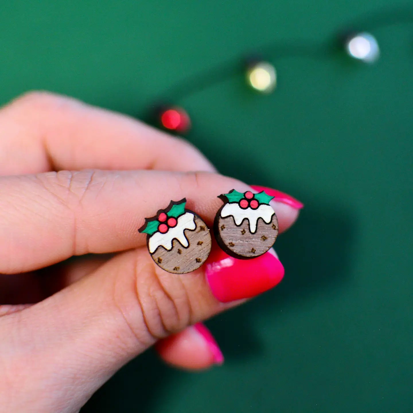 Cute and festive miniature Christmas pudding stud earrings with hand-painted holly detail.