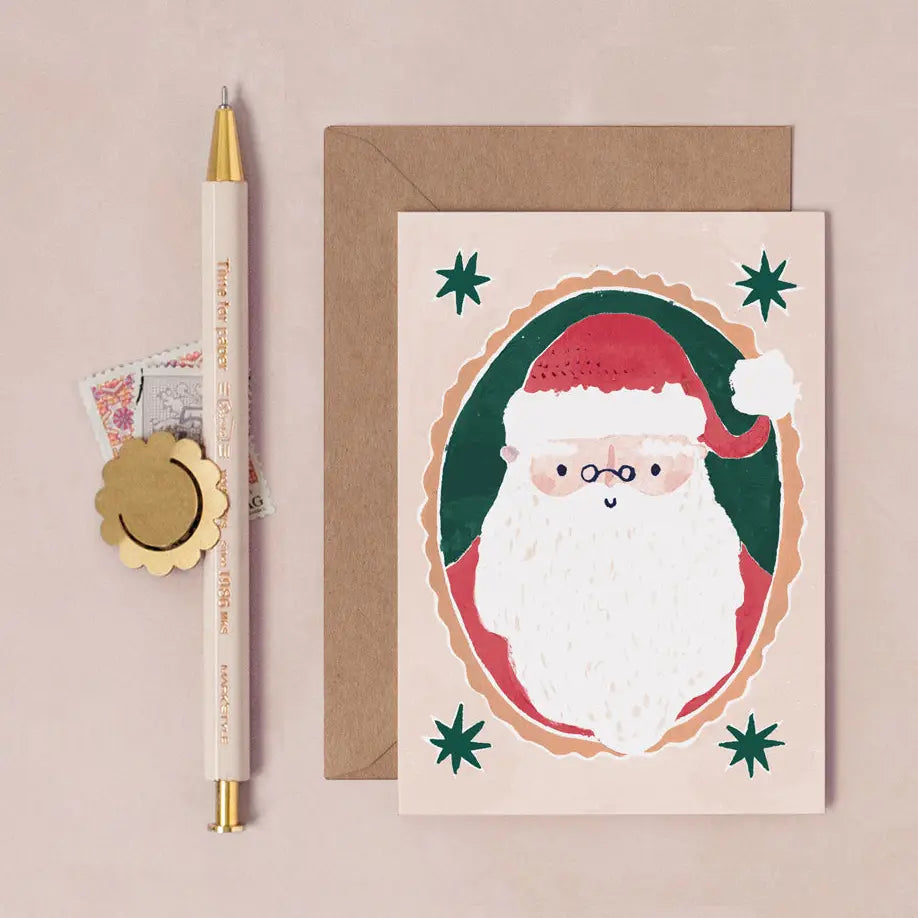 Ready for a jolly holiday, Santa has donned his miniature spectacles and classic red hat to begin the joyous task of delivering gifts for the big day. The hand-painted portrait of Santa on this mini Christmas card is full of childhood nostalgia, full of whimsical Christmas magic, and full of holiday cheer, making it a heartfelt holiday card for those thoughtful gifts.